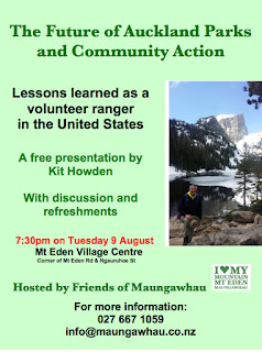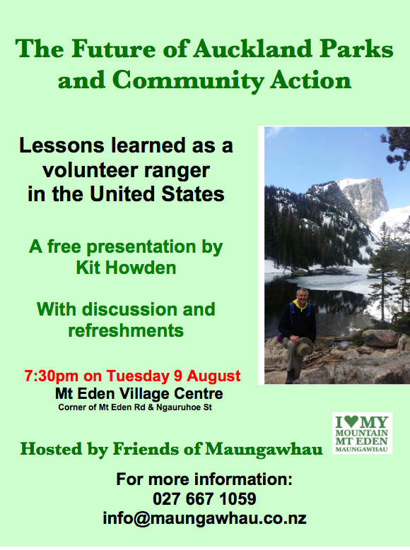 Kit has led the Friends of Maungawhau for many years and is well known as an advocate for urban green space, regional parks and biodiversity. He recently returned as a delegate to the 8th World Rangers Congress held in Colorado, and worked as a volunteer ranger in Yellowstone National Park.